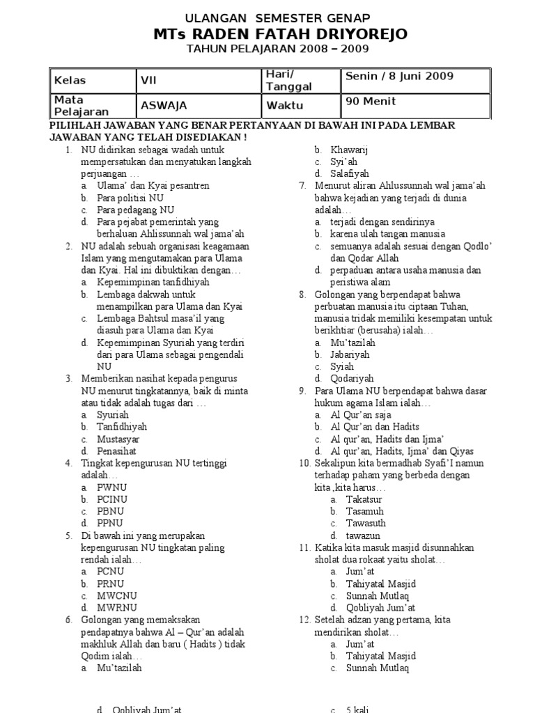 Soal Uts Aswaja Kelas 4 Mi Semester 1 Dan Kunci Jawaban Guru Galeri